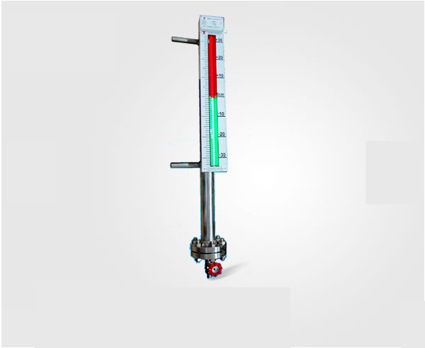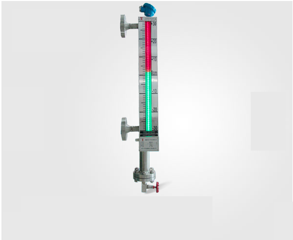 非磁性傳感器管通過(guò)上下法蘭與液體容器連通,在傳感器管內(nèi)裝有一個(gè)磁性浮子,浮子根據(jù)介質(zhì)的比重設(shè)計(jì),浮子內(nèi)磁鋼與容器內(nèi)液面等高,液位顯示盒內(nèi)感磁部件和LED雙色發(fā)光管上下有序排列,與磁場(chǎng)相對(duì)應(yīng)的感磁部件受磁后,觸發(fā)相應(yīng)的電路,無(wú)液全紅,滿液全綠;紅色顯示汽相,綠色顯示液相,紅綠交界處就是容器內(nèi)的實(shí)際液位,液綠汽紅,一目了然。